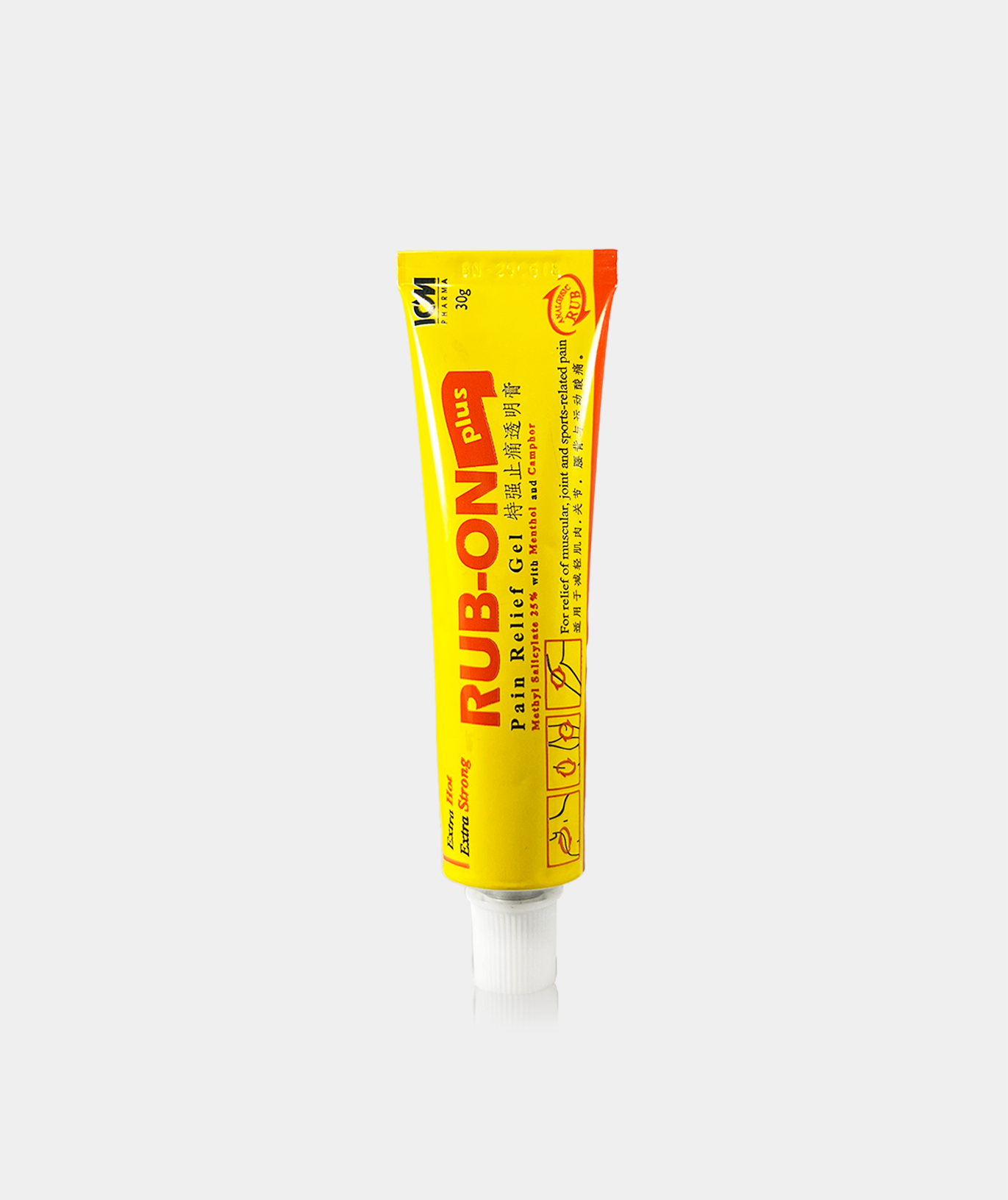 RUB-ON PLUS GEL is an extra strong and extra hot analgesic rub formula containing Methyl Salicylate, Menthol and Camphor used for the relief of muscular, joint and sports-related pain.